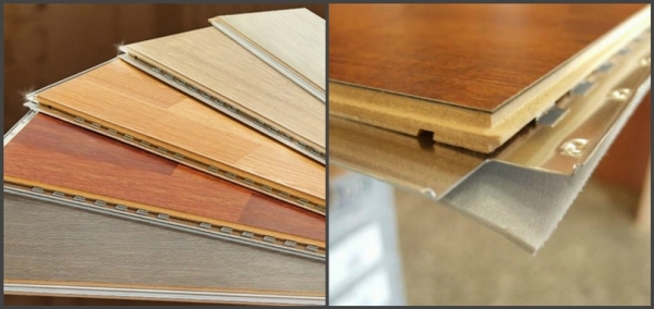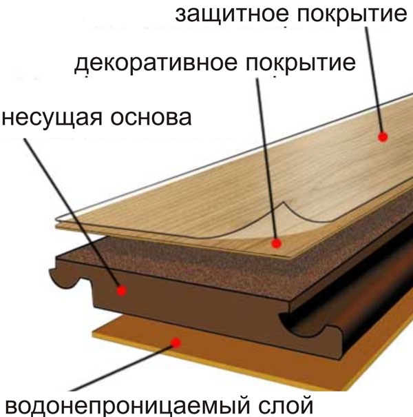 С лицевой стороны — декоративный ламинированный слой с имитацией древесной породы, с внутренней — влагозащищенный слой.